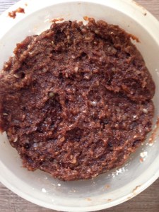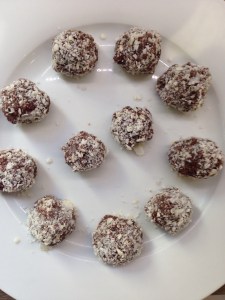 I made a batch of raw chocolate by melting a tea cup of coconut oil and mixing in 4 tablespoons of cacao powder (at this point, i challenge you simply to not eat the whole bowl!!). I then added in some chia seeds, cinnamon, peppermint oil. In a separate bowl I mashed with a fork 8 juicy dates with some warm water to make some caramel (OMG!!) and then added this to the chocolate bowl. The chocolate world really then is your oyster – you can add whatever else you want! cos I wanted to make these into truffles that would hold a shape i added in some ground almonds, stirring a spoon at a time until it was kind of thick. I then sprinkled some desicated coconut onto a plate and rolled The mixture in little balls into the coconut and popped in the freezer to set!